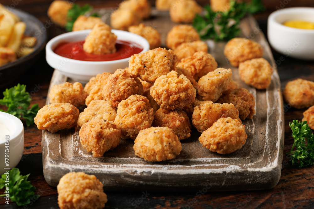 Crispy Popcorn Chicken with ketchup sauce on wooden board