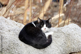 Angry white black cat sitting on the carpet on spring street