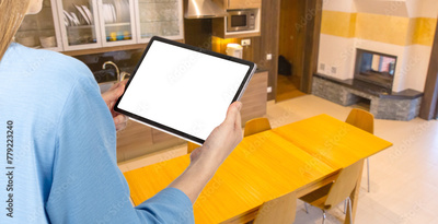 Woman with tablet computer. Girl with gadget is standing in kitchen. Woman is looking for moving company. Cropped lady with tablet. Place for advertising moving services. Relocation, removal