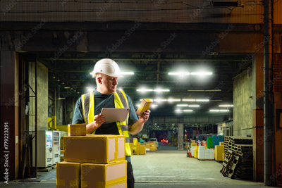 Man loader at industrial enterprise. Guy with boxes near factory gate in evening. Warehouseman accepts delivery. Warehouse manager with tablet. Loader keeps track incoming boxes. Warehouse employee