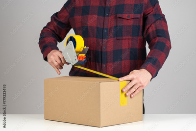 Sealing box with sticky tape. Dispenser for applying adhesive yellow scotch. Man packs parcel. Cardboard box on table. Packing goods for shipment. Parcel fulfillment. Cropped guy uses sticky tape