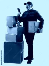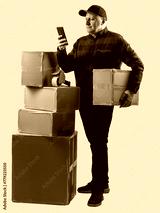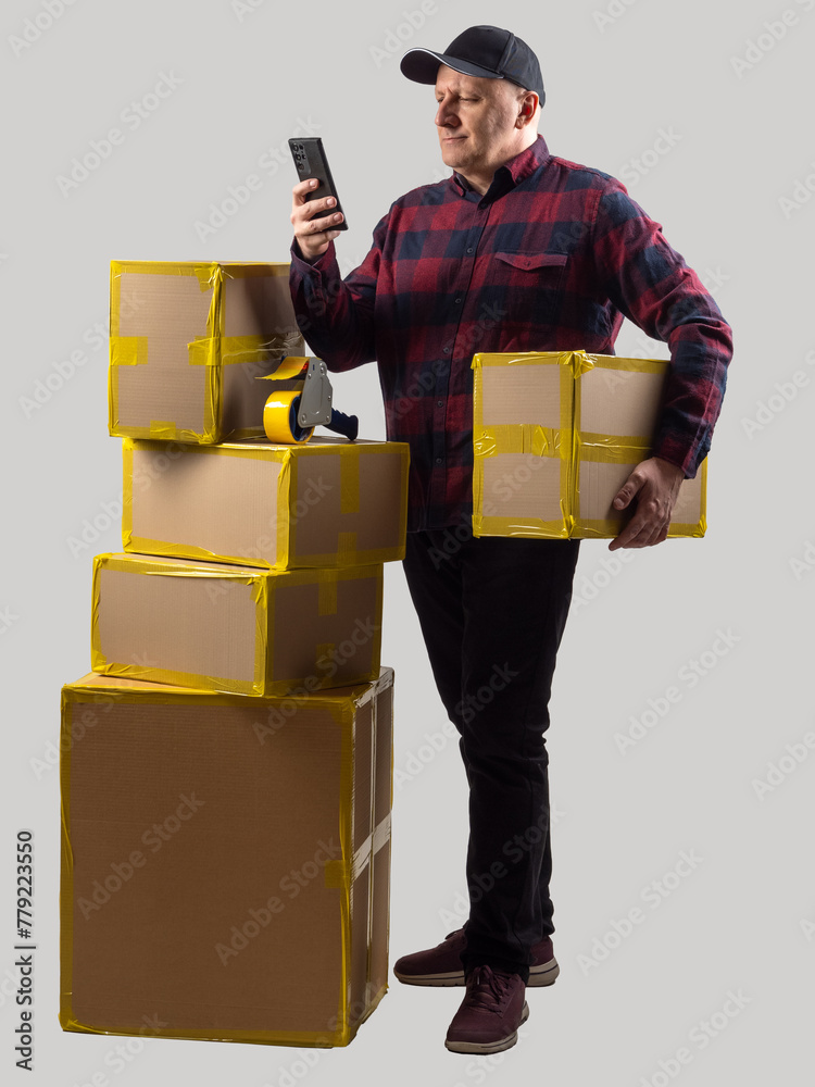 Business man with boxes. Packer guy holding phone. Businessman stands near packaged goods. Worker uses cardboard packaging. Man calls delivery service. Businessman packed online orders. Stack boxes