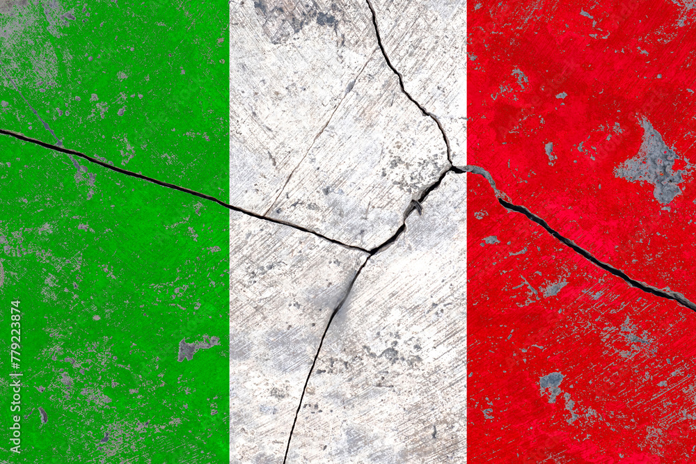 Broken flag of Italy. National symbol on wall. Patriotic flag with crack. Banner Italian republic. Stone surface with state sign. Italian background. Metaphor of devastating crisis in Italy. 3d image