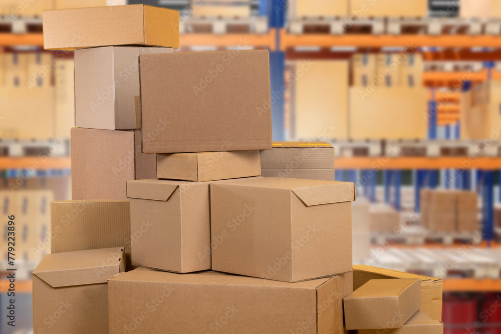 Cardboard boxes. Bunch of parcels at courier warehouse. Delivery service storage. Stack of boxes near warehouse racks. Cardboxes await placement in addressable storage system. Selective focus