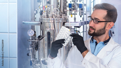 Man pharmacist. Doctor with pills. Pharmacept near bioreactor. Pharmacologist in white coat. Medical laboratory employee. Pharmacept produces prescription drugs. Man with pills in blisters