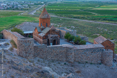 Sunrise view of Khor Virap Monastery standing in front of Ararat moutain in Armenia