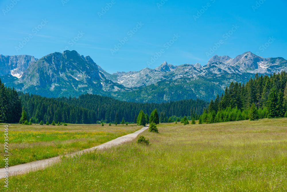 Peaks of Durmitor national park viewed behind a meadow, Montenegro
