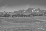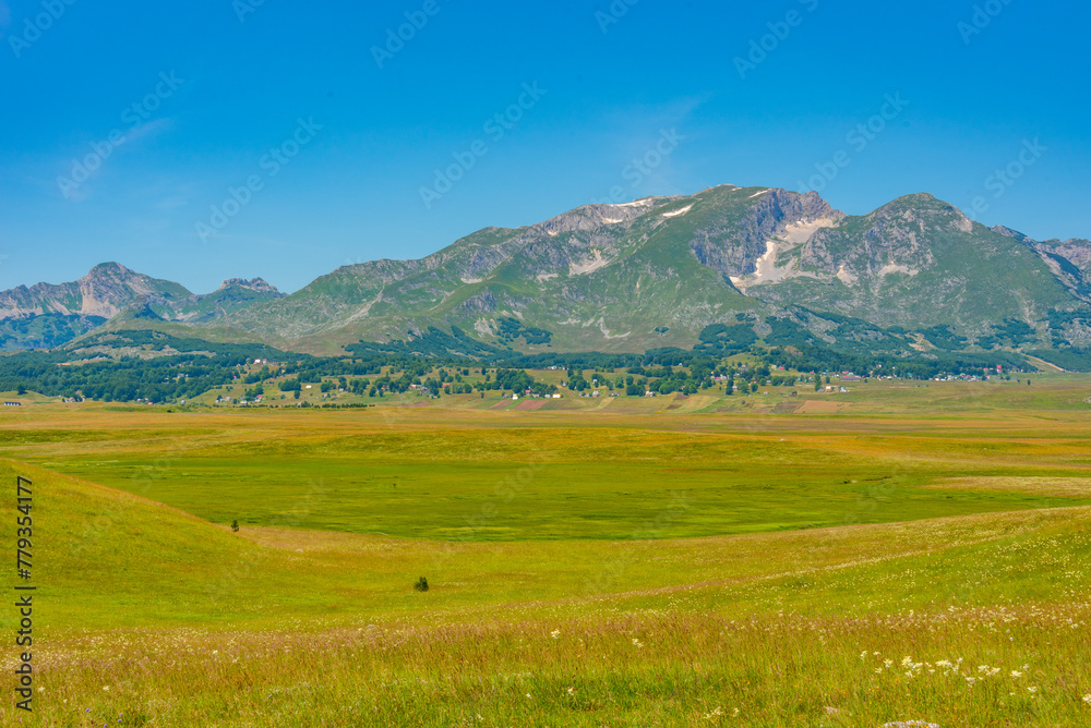 Peaks of Durmitor national park viewed behind a meadow, Montenegro
