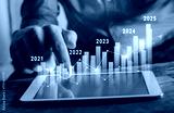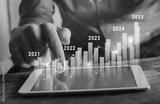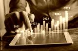 Yearly finance and growth report, column chart with company progress by year, 2025, businessman calculates financial data for long term investments.