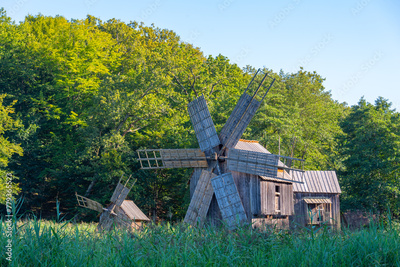 Wooden windmills at Astra ethnography museum in Sibiu, Romania