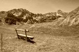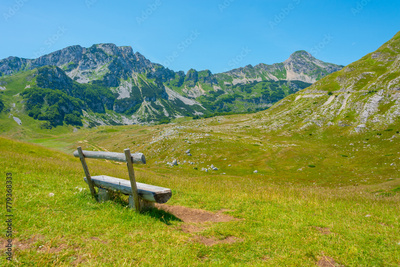 Bench at Durmitor national park viewed behind a meadow, Montenegro