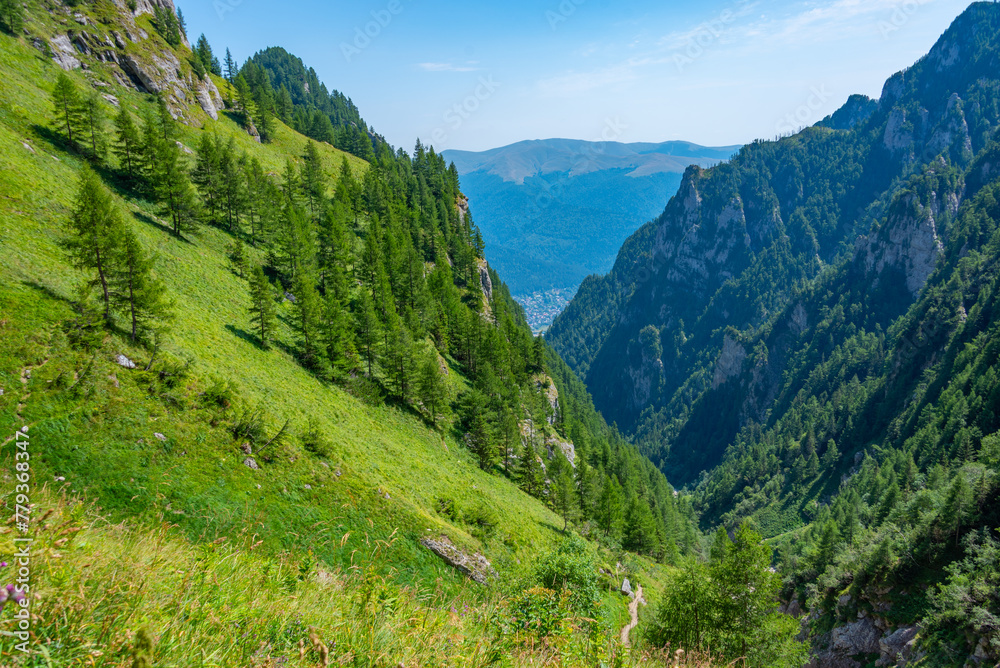 Summer day at Caraiman valley leading to Bucegi mountains near Busteni village in Romania