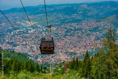 Trebevic gondola raising from the old town of Sarajevo, Bosnia and Herzegovina