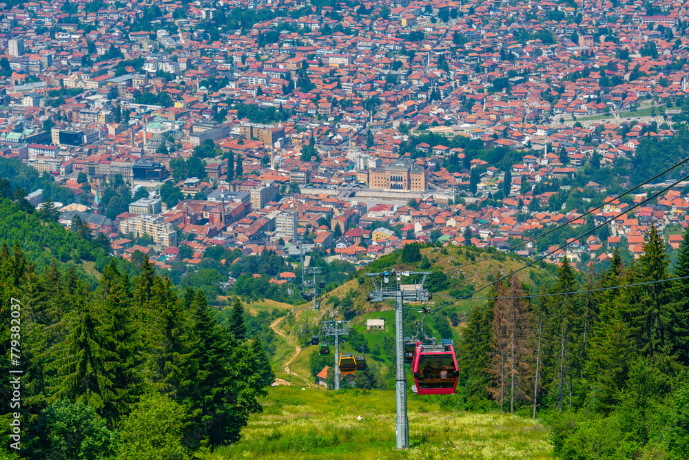 Trebevic gondola raising from the old town of Sarajevo, Bosnia and Herzegovina