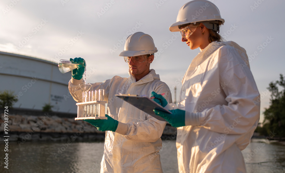 Scientist factory wearing protective uniform and glove under working water analysis and water quality by get waste water to check case in laboratory is environment pollution problem concept.