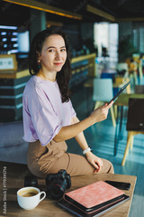 Photographer female student with coffee using laptop working with photography in coworking space, young freelancer working remotely with web design