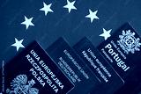European union countries passports on blue EU flag close up. Portugal, German, French and Polish passports