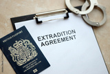 Passport of Great Britain and Extradition Agreement with handcuffs on table close up