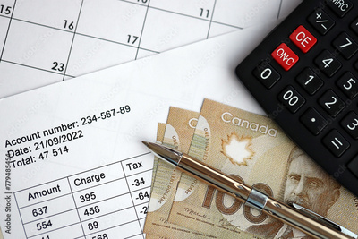 Many calculation results in schedules lies on table with canadian money bills, calculator and pen close up. Taxation and annual accountant paperwork in Canada