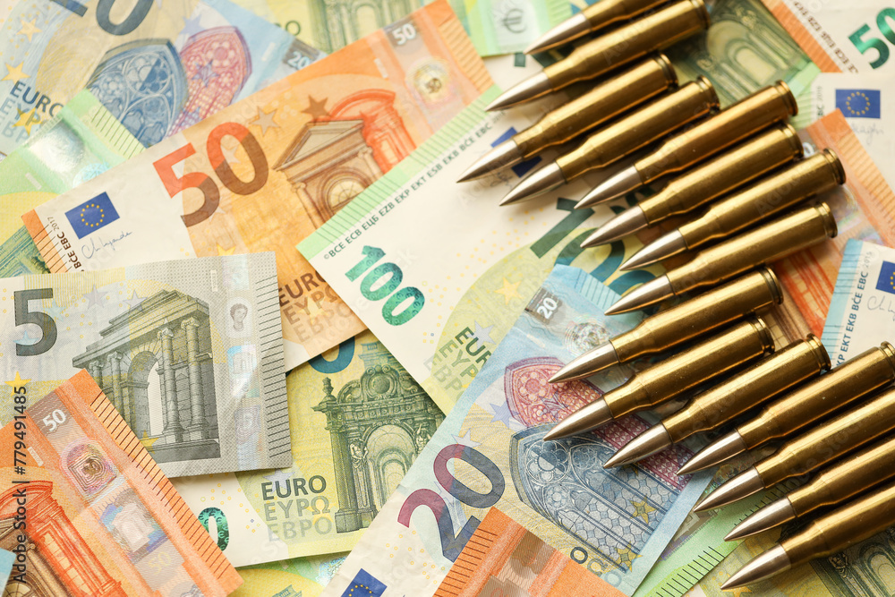 Yellow cartridges and shell casings on euro banknotes. Lot of bills of European union currency and ammo close up