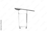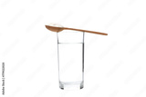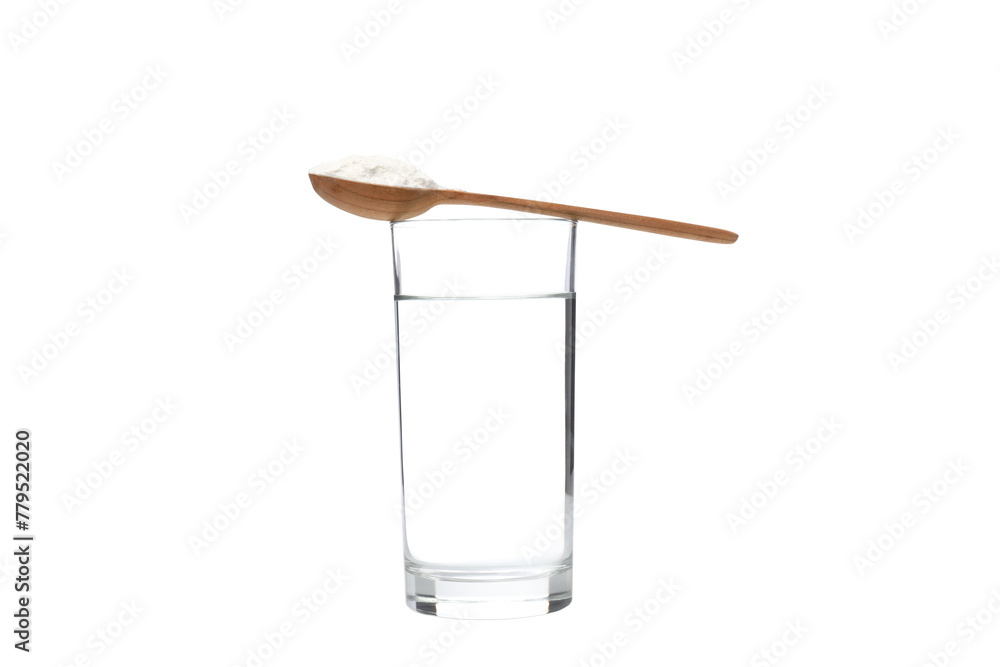 PNG,A wooden spoon with collagen and a glass of water, isolated on white background
