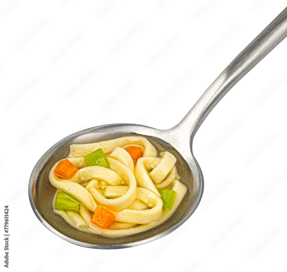 Instant noodle soup in spoon isolated on white background, top view