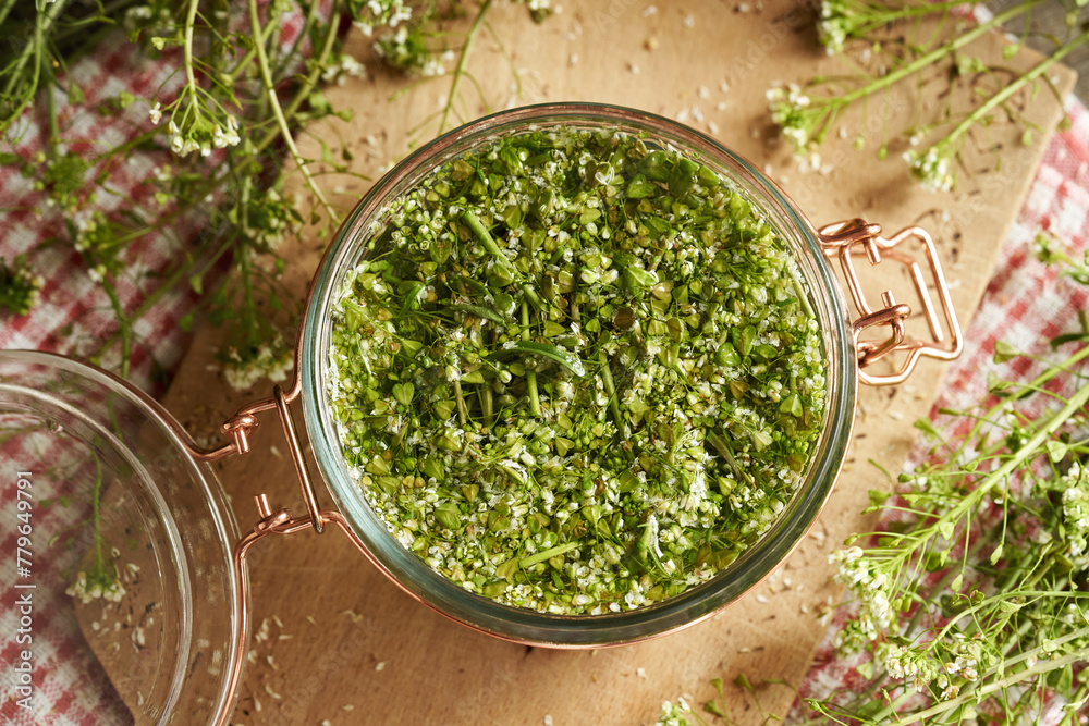 Preparation of herbal tincture from fresh wild blooming shepherd's purse plant in a glass jar