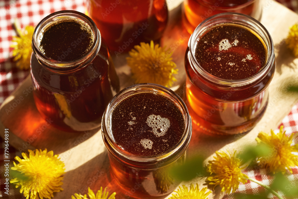 Several jars of dandelion honey - syrup made from fresh dandelion flowers in spring