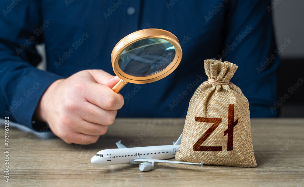 Monitoring the payment of taxes in the aviation industry and polish zloty money bag. Fostering financial integrity, regulatory adherence, and sustainable growth. Budgeting and investment.