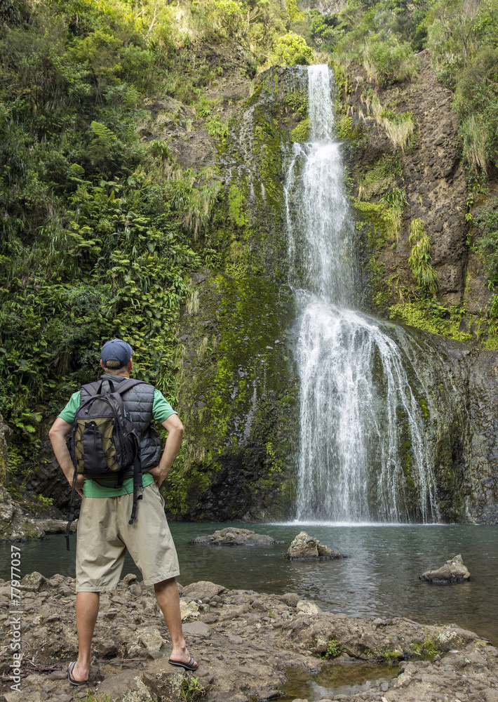 Man hiking to a beautiful tropical waterfall