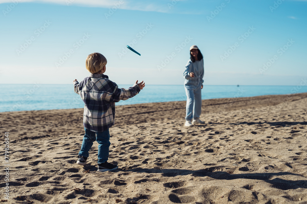 Mom plays frisbee with a boy in the sea. young woman and boy playing frisbee on the seashore. outdoor game with a child at sea