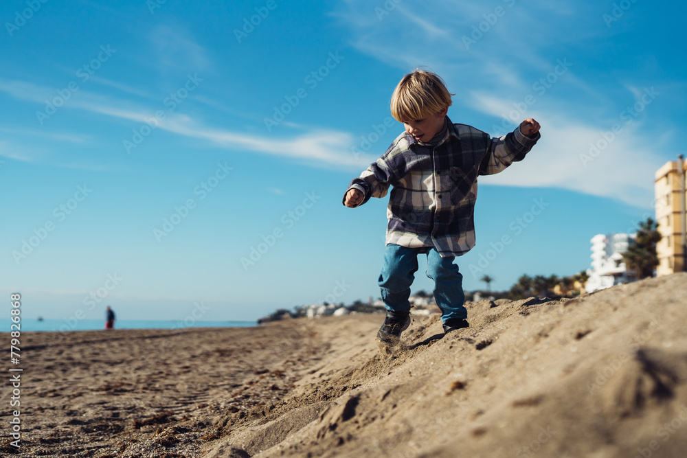 The boy jumps up on the sandy beach near the sea. a 3-year-old boy in a checkered shirt plays on the sand. cheerful active baby jumping on the sand