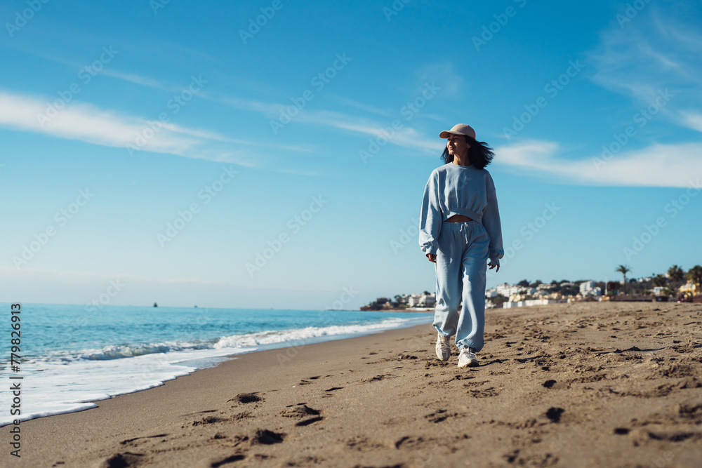 Young woman tourist in blue sport suit walks along the seashore, enjoys the seascape. Travel, tourism concept. Active lifestyle.