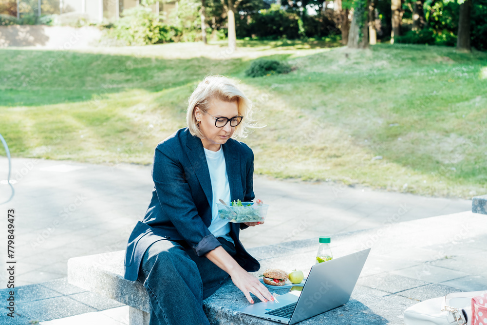 Business woman eating fast and healthy in front of laptop during job lunch break outdoors. Modern business lifestyle. Middle aged lady eats salad and use notebook pc on bench. Balanced diet lunch box.
