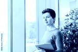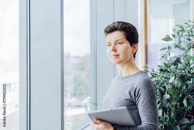 Middle aged minded pensive employee business woman holding digital tablet and day dreaming while looking through the window from her office. Dreaming, planning, Taking time for recovery. Copy space