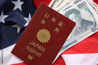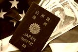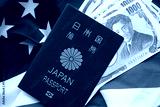 Japan passport with japanese yen money bills on United States flag close up