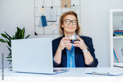 Successful relaxed dreamy middle aged business woman is resting at her work place, enjoying coffee break. Smiling confident middle-aged experienced senior female professional enjoying her coffee drink