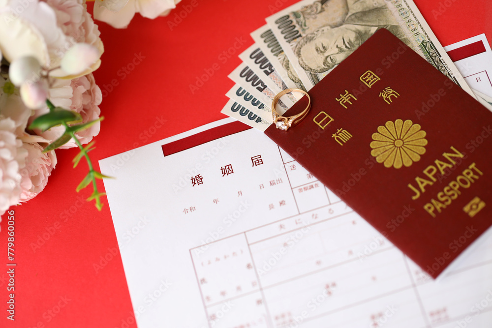 Japanese marriage registration blank document and wedding proposition ring and yen money on table close up