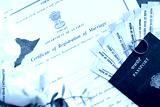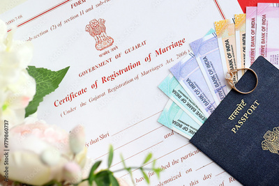 Indian Certificate of registration of marriage blank document and wedding ring with rupiah money on table close up