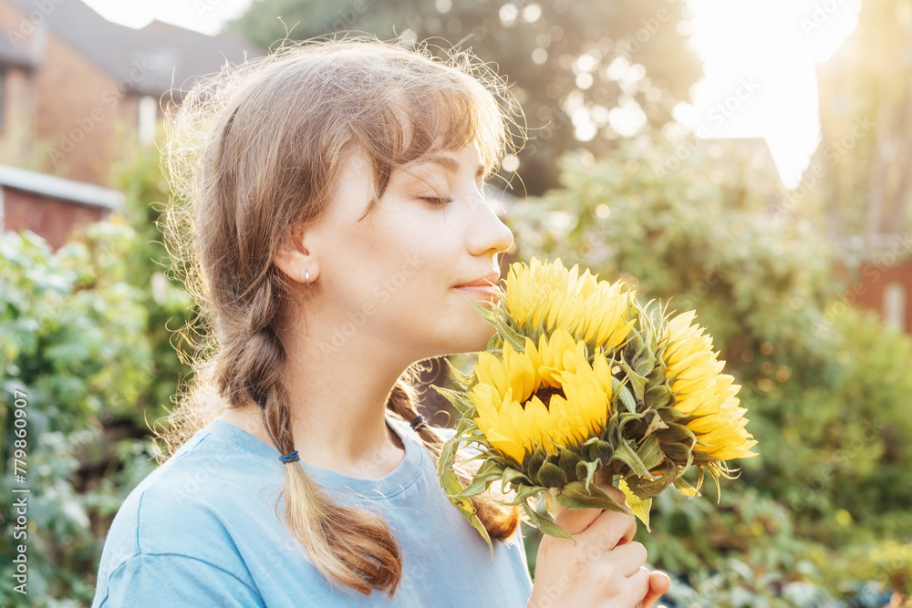 Dreaming young female farmer woman with closed eyes holding and sniffing a sunflowers bouquet on the green garden background in sunset light. Enjoy the moment. Rural, Cottage core lifestyle.