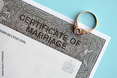 Canadian Certificate of registration of marriage blank document and wedding ring close up