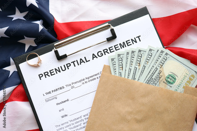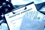 Prenuptial agreement and wedding ring on table. Premarital paperwork process in USA close up