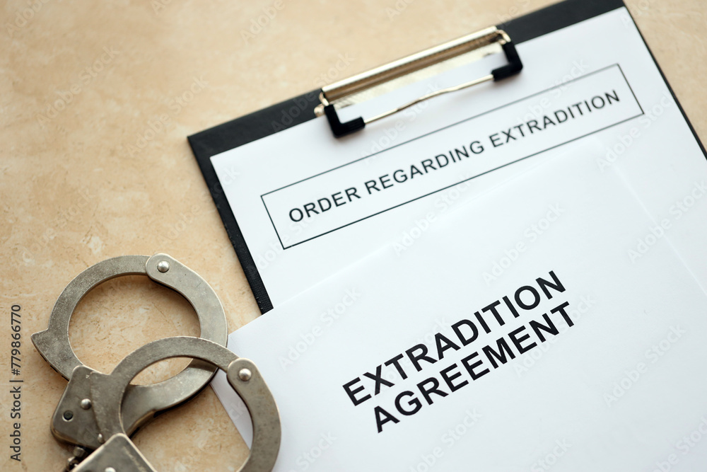 Extradition Agreement and Order Regarding Extradition with handcuffs on table close up