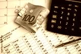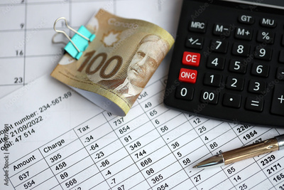 Many calculation results in schedules lies on table with canadian money bills, calculator and pen close up. Taxation and annual accountant paperwork in Canada