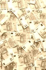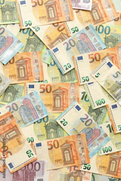 Many european euro money bills. Lot of banknotes of european union currency close up