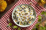 Fresh common daisy flowers in a bowl - ingredient for herbal syrup