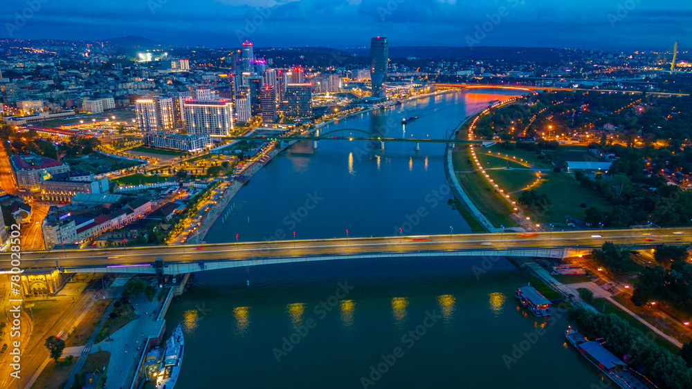 Sunset over Downtown Belgrade viewed behind the Sava river in Se