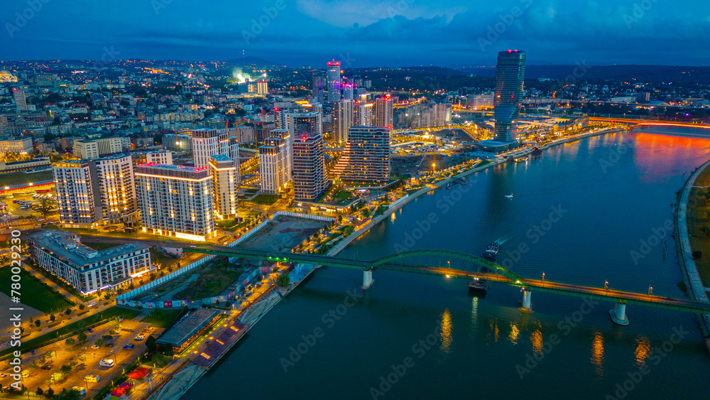 Sunset over Downtown Belgrade viewed behind the Sava river in Se