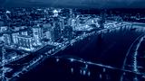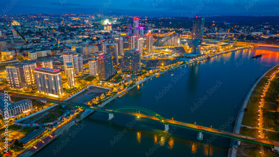 Sunset over Downtown Belgrade viewed behind the Sava river in Se