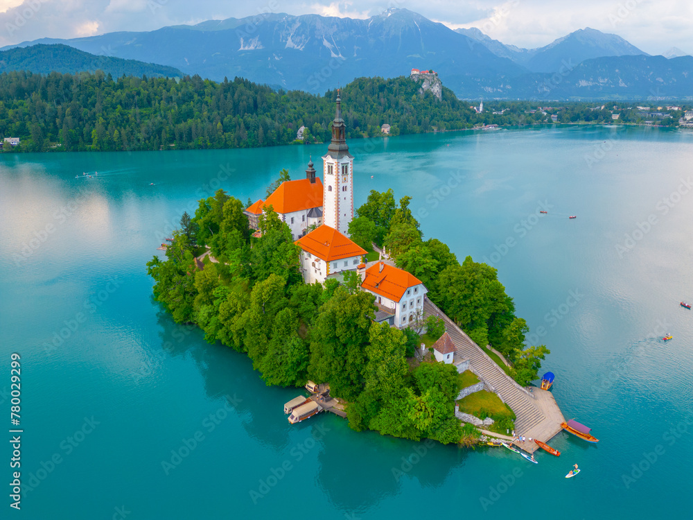 Aerial view of Assumption of Maria church at lake Bled in Sloven